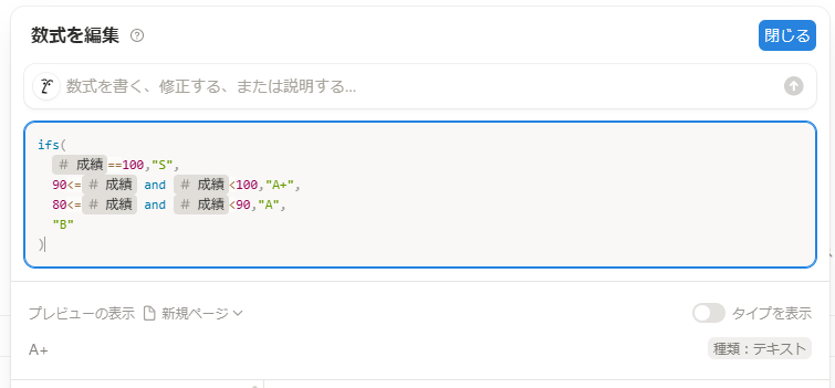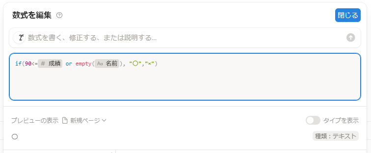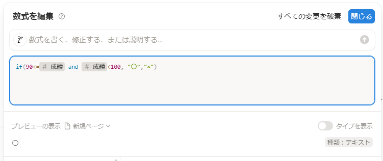 - if( and(90<=prop(“成績”) , prop(“成績”)<100) , “〇”, “×”) :もし成績が90~99なら〇、それ以外は×