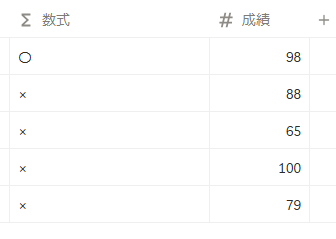 - if( 90<=prop(“成績”) and prop(“成績”)<100 , “〇” , “×”) :もし成績が90~99なら〇、それ以外は×