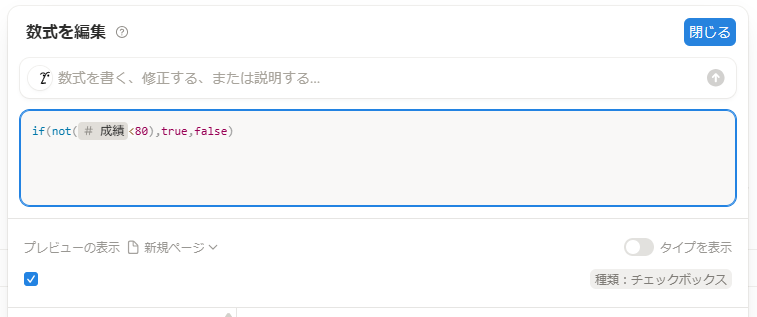- if( not( prop(“成績”)<80), true, false) :もし成績が80未満でなければtrue、それ以外はfalse