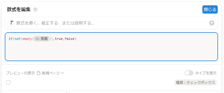 - if( not(empty( prop(“名前”)) ), true, false) :もし名前が空欄でなければtrue、それ以外はfalse