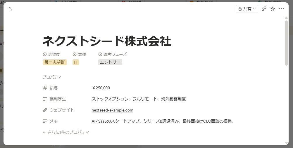 その後、「企業を追加」ボタンを押して、Notionで記録したい企業情報を記入します。