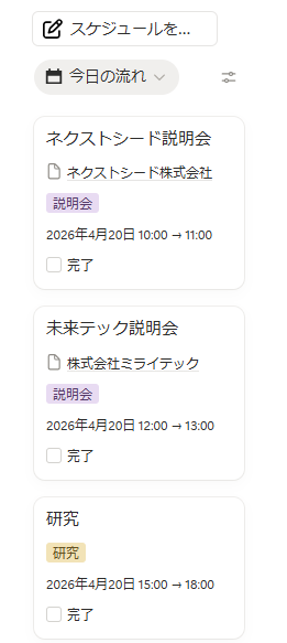 - 今日のスケジュールをカレンダービューで時間順に自動表示