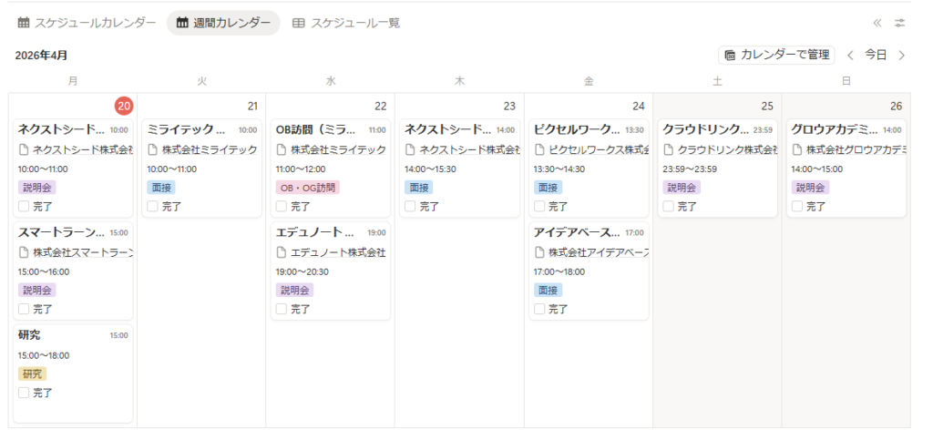 | 直近1週間のES締切ビュー | ES締切を1週間先まで表示 | ESスケジュール管理DBから自動絞り込み |