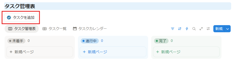 | タスク管理表(カンバン) | 進行中/完了の2列で管理 | 完了に動かすと自動で非表示 |