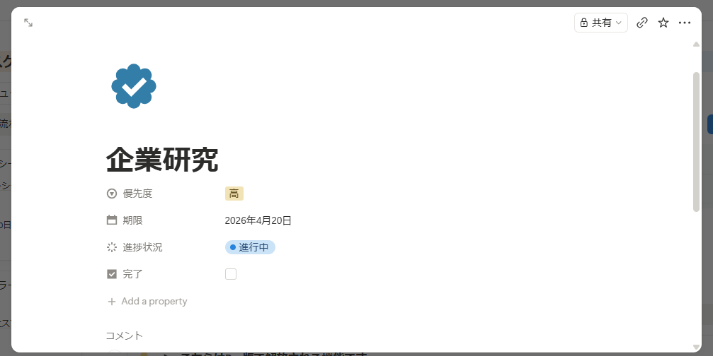 タスクの優先度、期限、進捗を記入します。