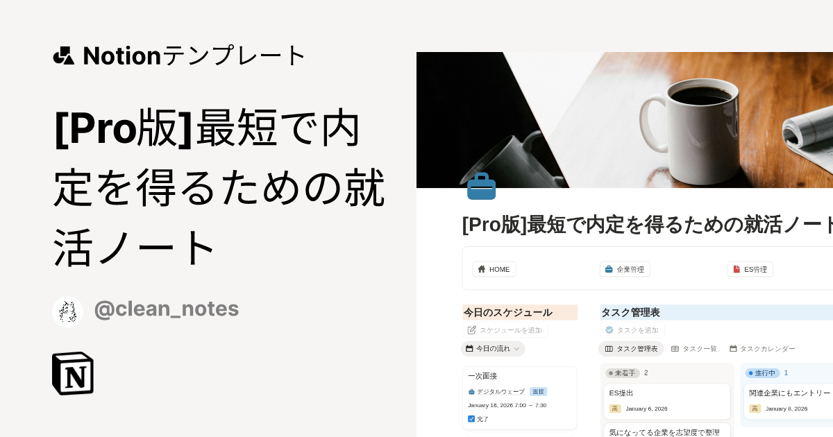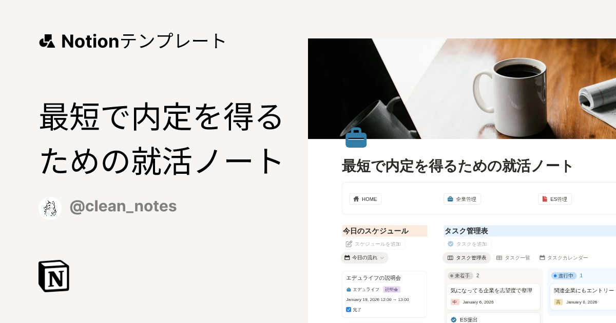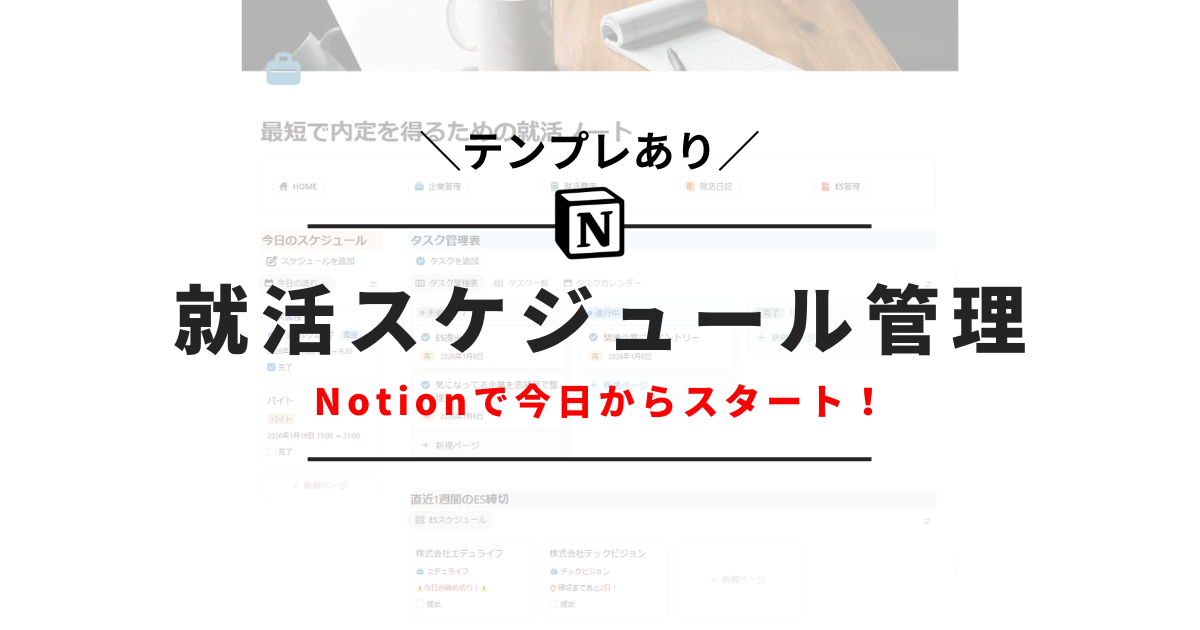 ここに エントリー企業管理/ES管理/面接対策/日記/費用管理 が同じテンプレ内で繋がるので、スケジュール管理が「予定を書く作業」ではなく「就活全体のダッシュボード」になります。