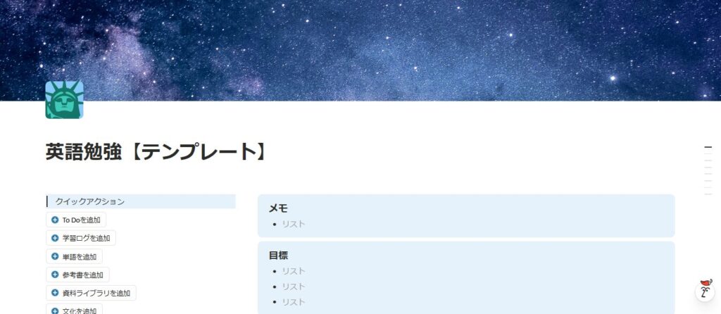 語学学習では、「単語帳」「フラッシュカード」「学習ログ」機能があるテンプレートがおすすめです。