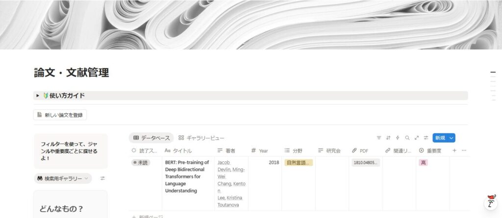 非常にシンプルな構成で論文管理がしやすいです。データベースで論文を管理しますが、ページ内にメモのフォーマットがあるのですぐに使えるのもおすすめポイントです!