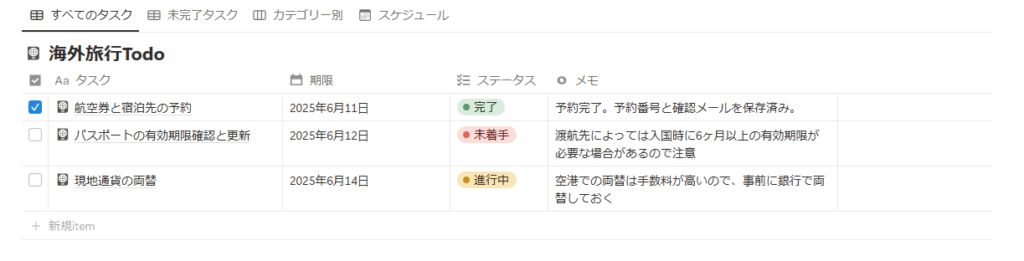 Notionでは、チェック済みの項目のテキストに取り消し線が自動的に入るため、視覚的に管理がしやすくなります。